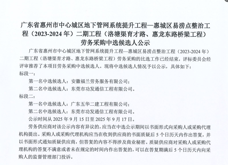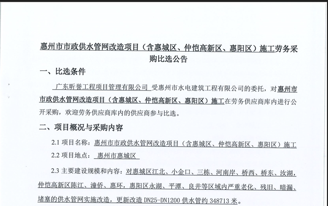廣東省惠州市中心城區地下管網系統提升工程-內街小巷排水管網病害修復及錯混接改造項目一期施工勞務采購比選公告……